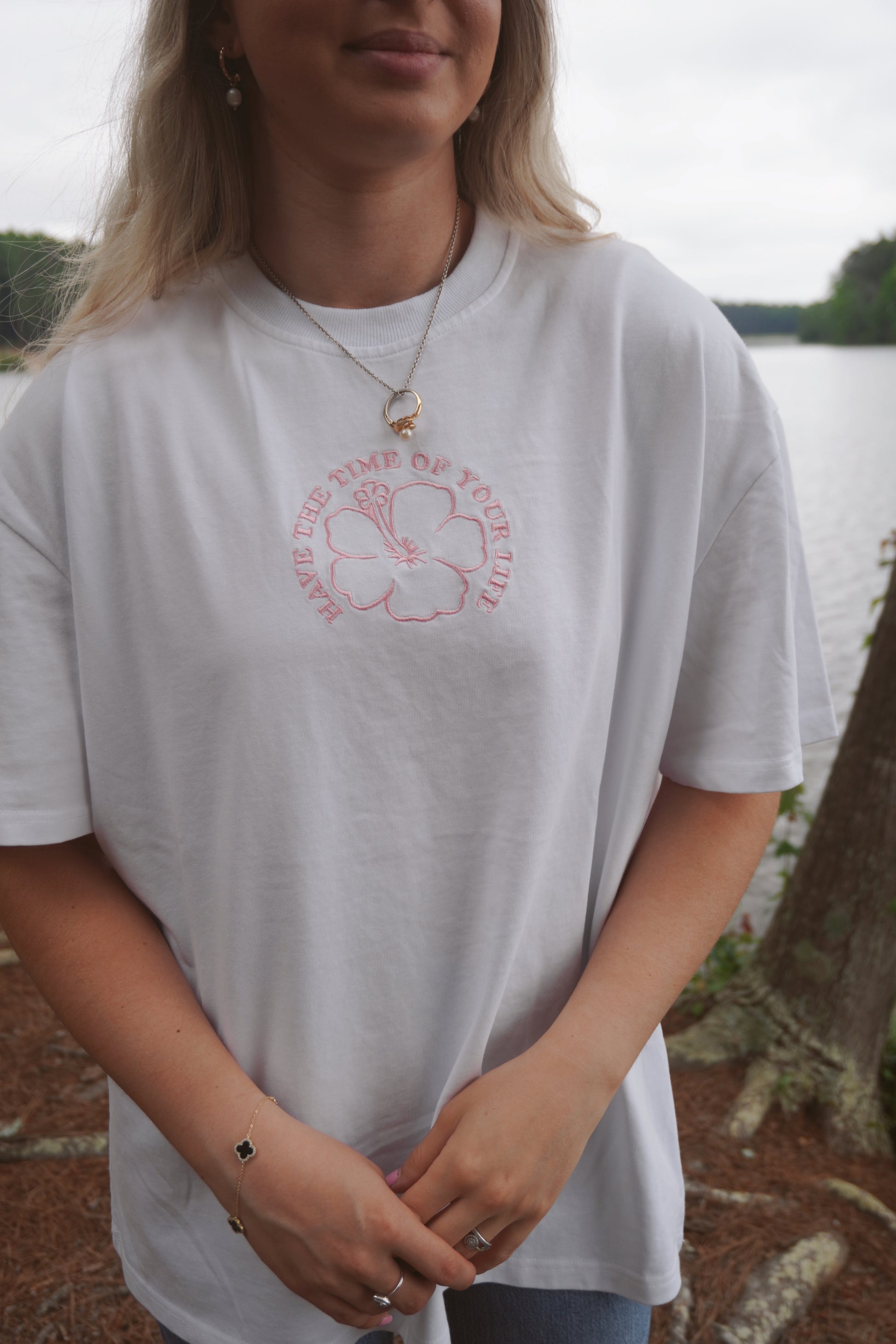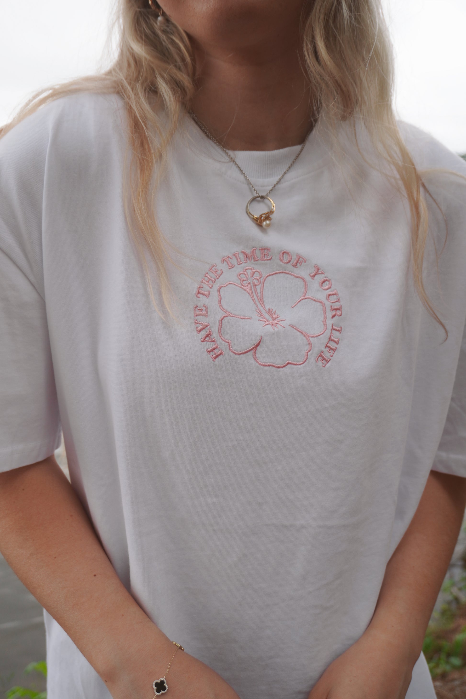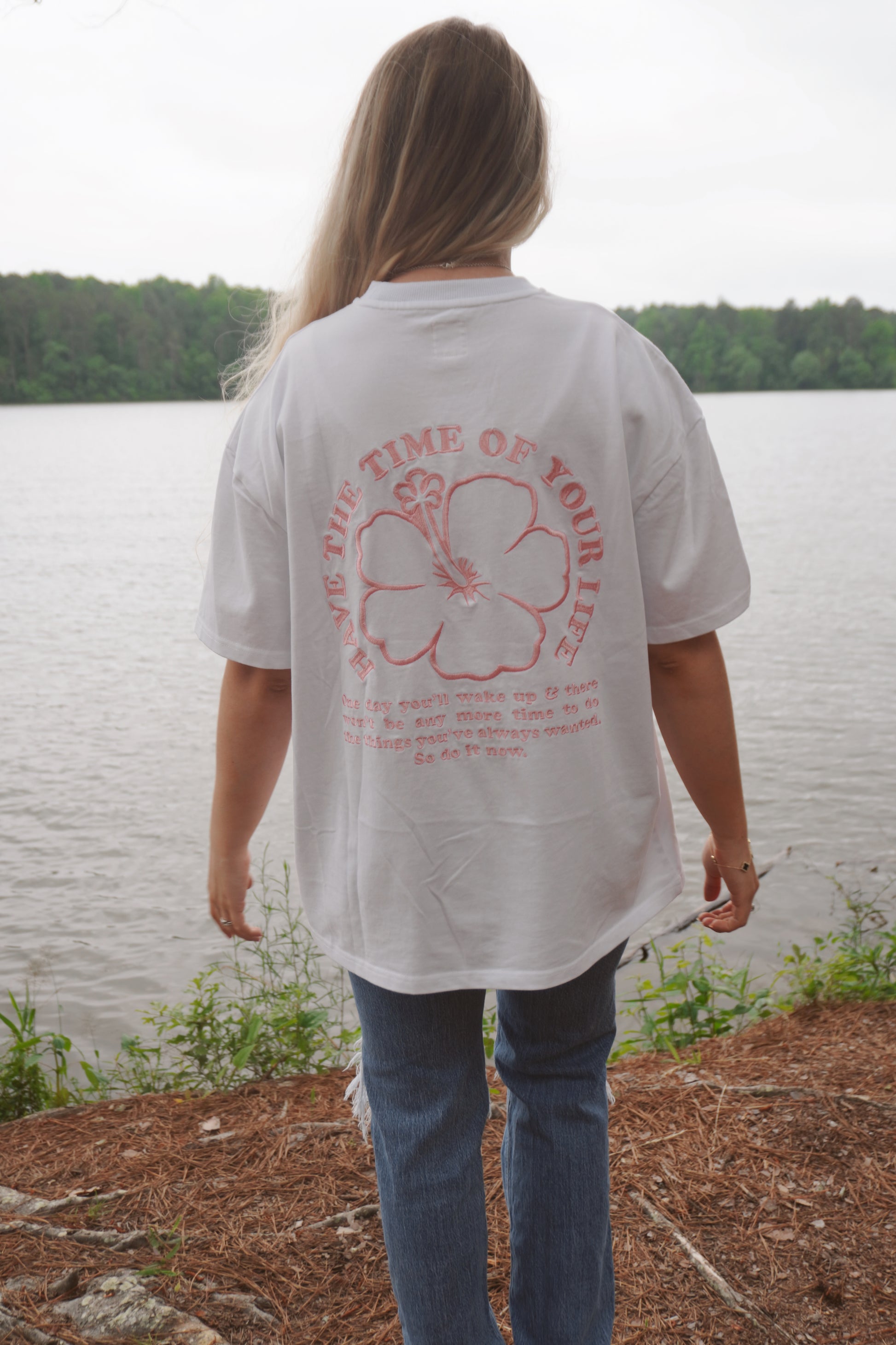 Its embroidered hibiscus design states, “HAVE THE TIME OF YOUR LIFE” and, “One day you'll wake up & there won't be any more time to do the things you've always wanted. So do it now."