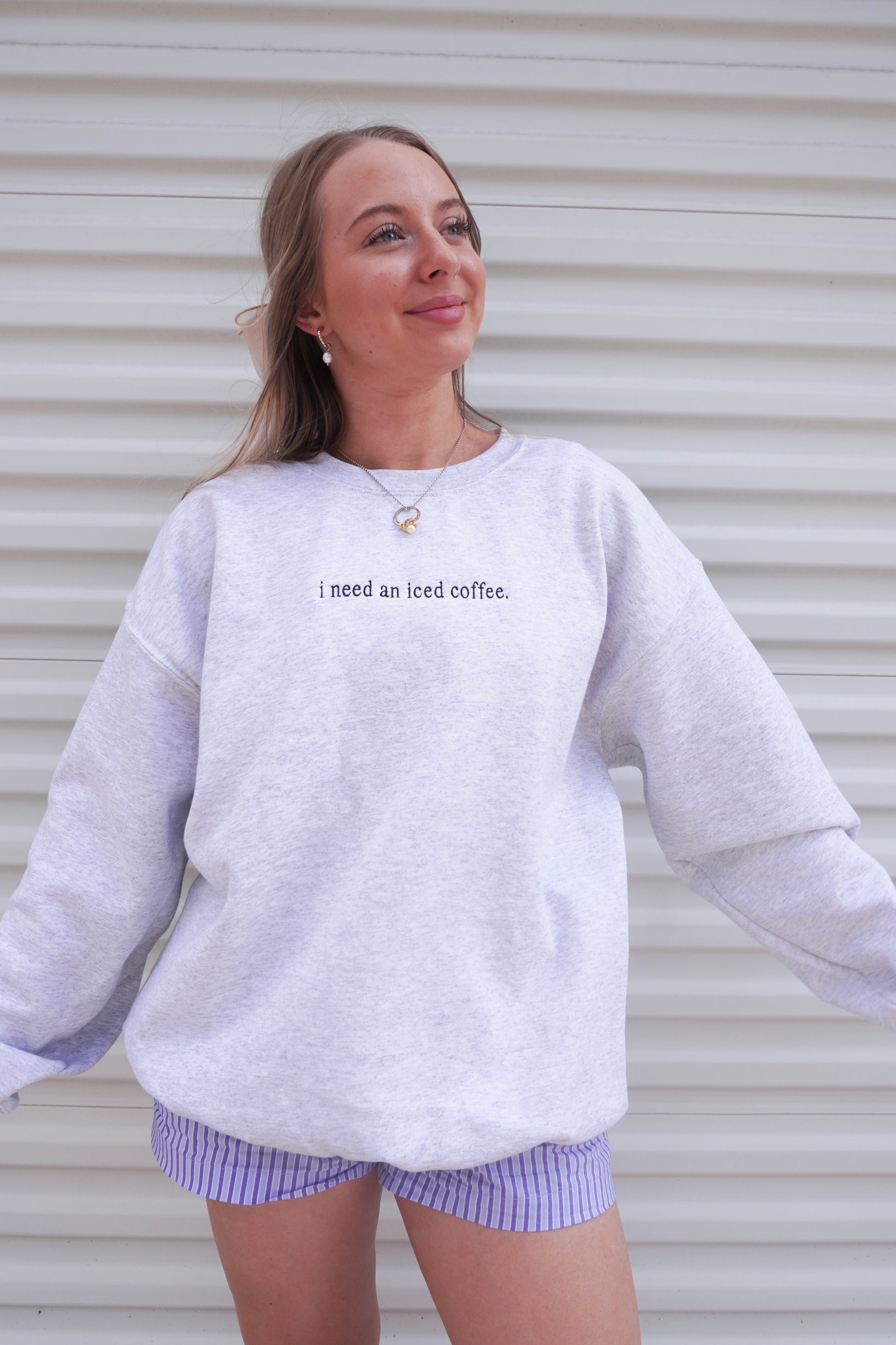 Going on a coffee run? This crewneck is the perfect addition for all of my iced coffee lovers. This sweatshirt is soft, lightweight, and embroidered. This crewneck is an ash-gray color with black embroidery. Made here in the U.S.