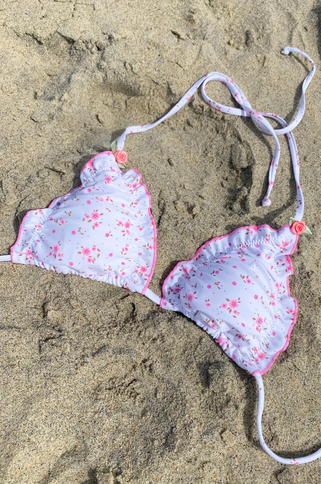 Introducing our Pink Floral Triangle Bikini, the must-have swimwear for your perfect summer look. This bikini features a beautiful pink floral pattern that brings a touch of femininity and elegance to your beach or poolside attire. Designed with rushing detail, which adds dimension and style to your silhouette. The adjustable straps provide enhanced comfort and enable you to customize the fit to your liking. Whether you prefer light support or an extra boost, the removable padding allows you to achieve the perfect level of support and coverage. This bikini is perfect for lounging by the pool, soaking up the sun at the beach, or enjoying water activities. Get ready to turn heads and make a stunning statement this summer with our Pink Floral Triangle Bikini.