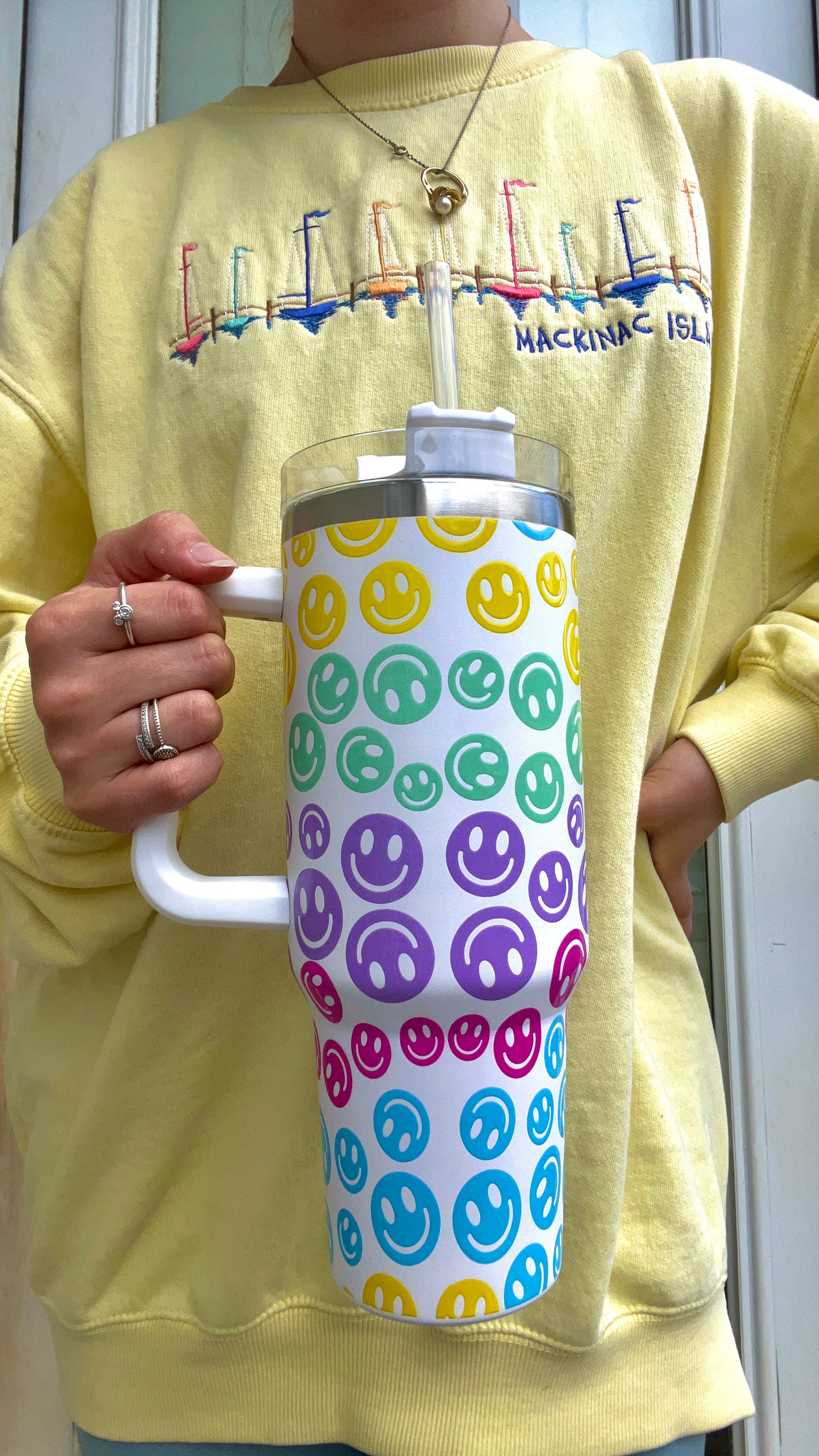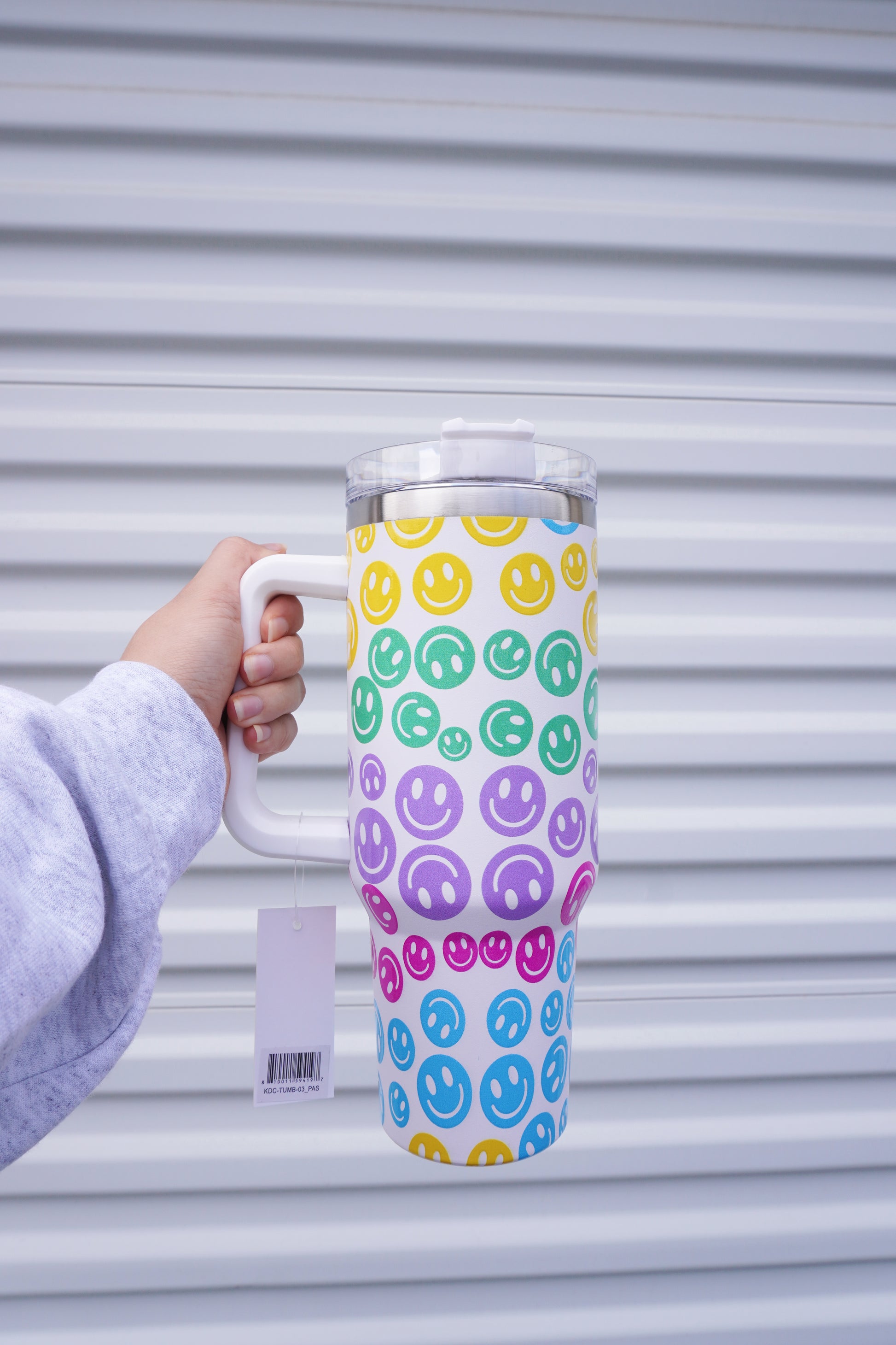 This Smiley Tumbler is a great new addition to your day. It’s 40oz and should fit in all cup holders, making it easy to take with you on the go. It comes with a reusable straw and it’s dishwasher safe so cleanup is a breeze! It has a sturdy handle that helps support the weight of your drink while holding the sliding cover on top securely closed. It’s made of metal to keep your summer drinks cold!